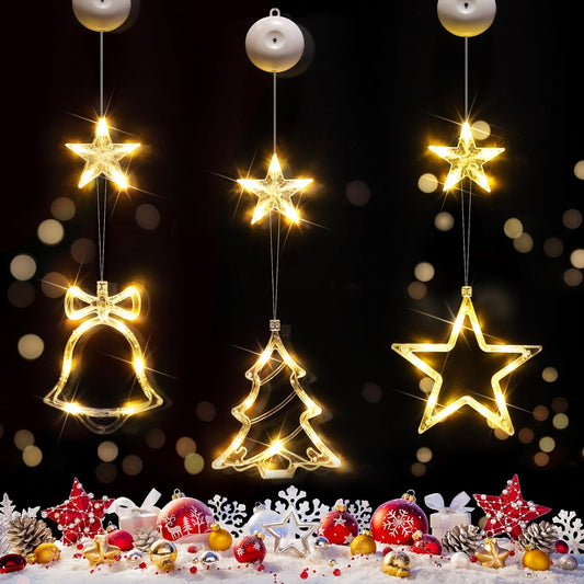 SUDDUS 3-Pack Battery Operated Window LED Lights with Suction Cups, Tree + Bell + Star Icons, Multicolor Hanging String Lights with Timer for Indoor Holiday Décor