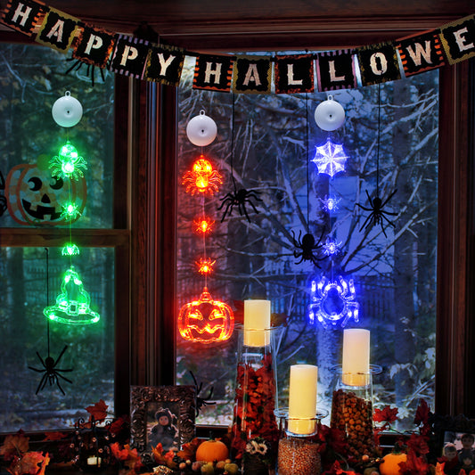 SUDDUS 3-Pack Halloween Window Lights – 20.9″ Pumpkin & Spider LED Battery-Operated Window Hangings with Suction Cups, Orange & Purple Decor