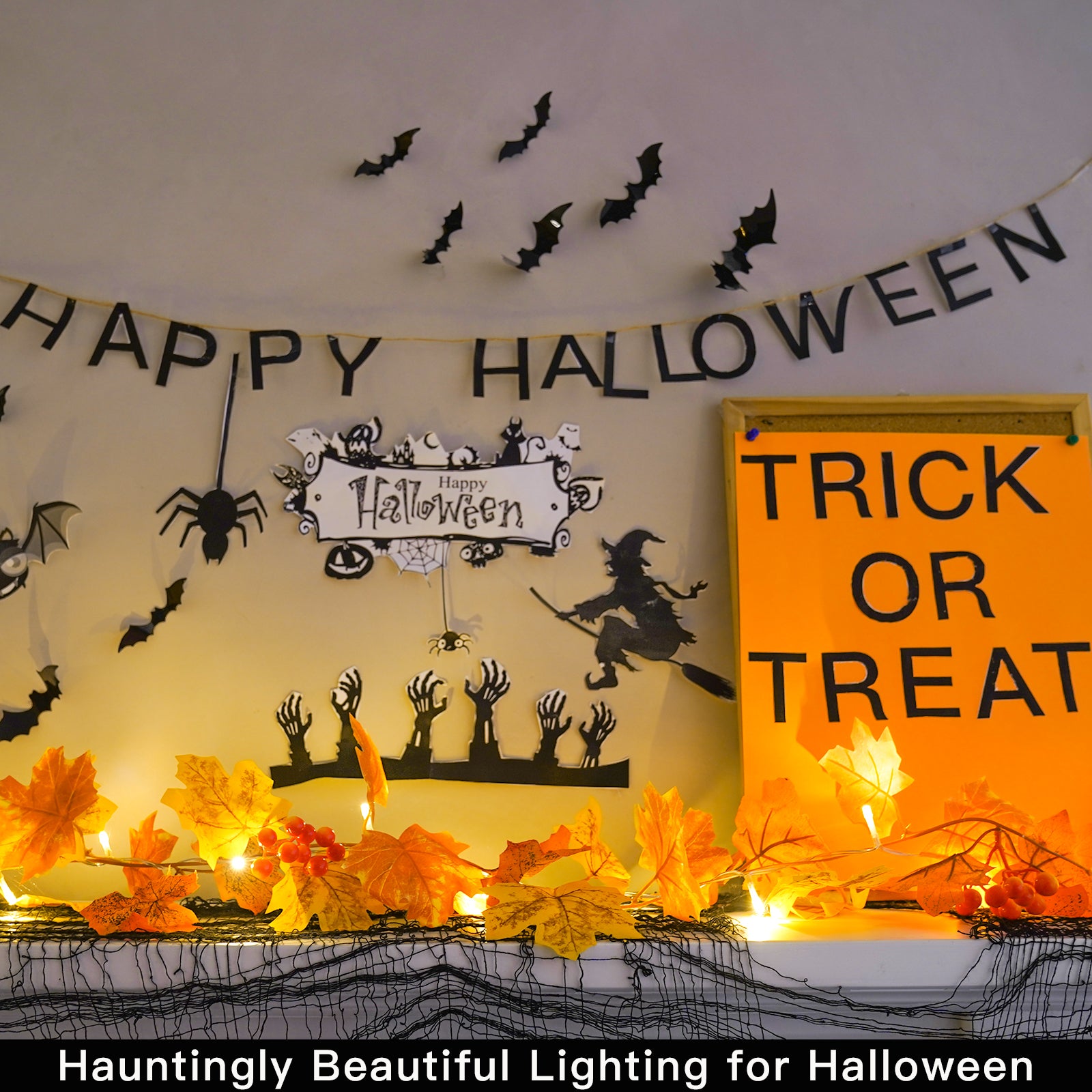 Comes pre-strung with 20 warm LED bulbs interwoven with lifelike maple leaves and vibrant orange berries—no assembly required. Just unpack and decorate. -